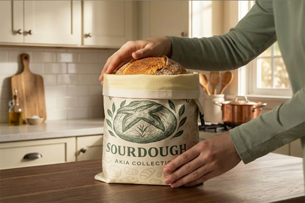 Store homemade bread the zero-waste way. Our XL beeswax cotton bags seal in moisture for days — soft inside, crisp crust outside. Each set includes 2 bread bags and a beeswax bowl cover for dough proofing. Counter, fridge, and freezer friendly.